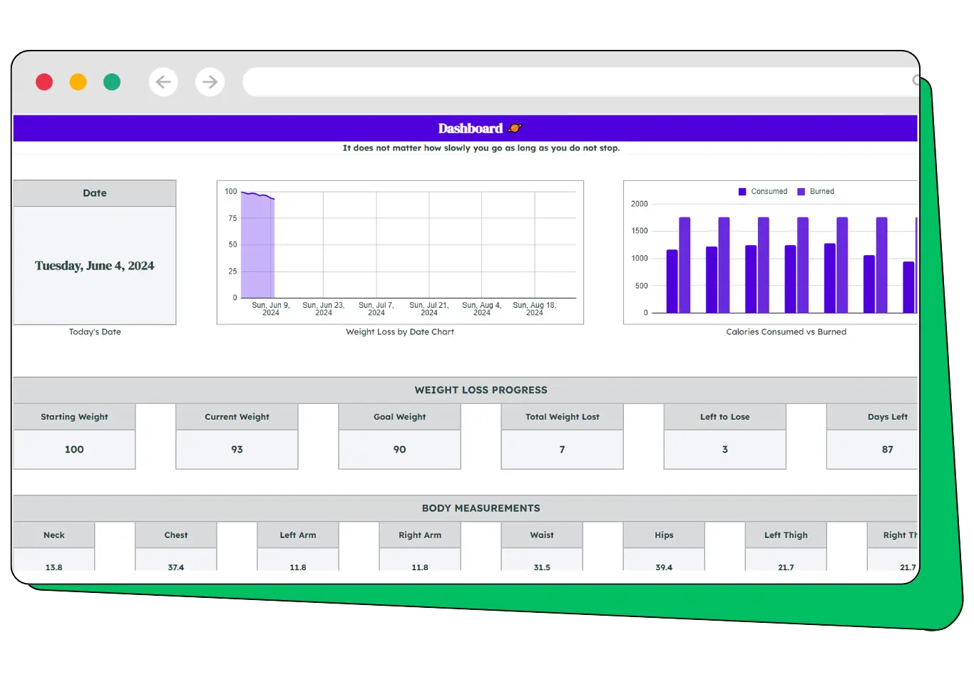 Simply input your daily weight, and the tracker will do the rest. It calculates the difference from your initial weight and your goal weight, keeping you informed and motivated.