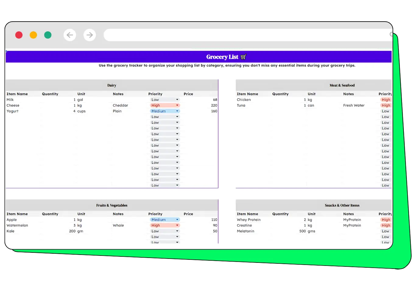 Keep track of each item's priority, price, and quantity to ensure you don’t miss any essential items during your grocery trips.