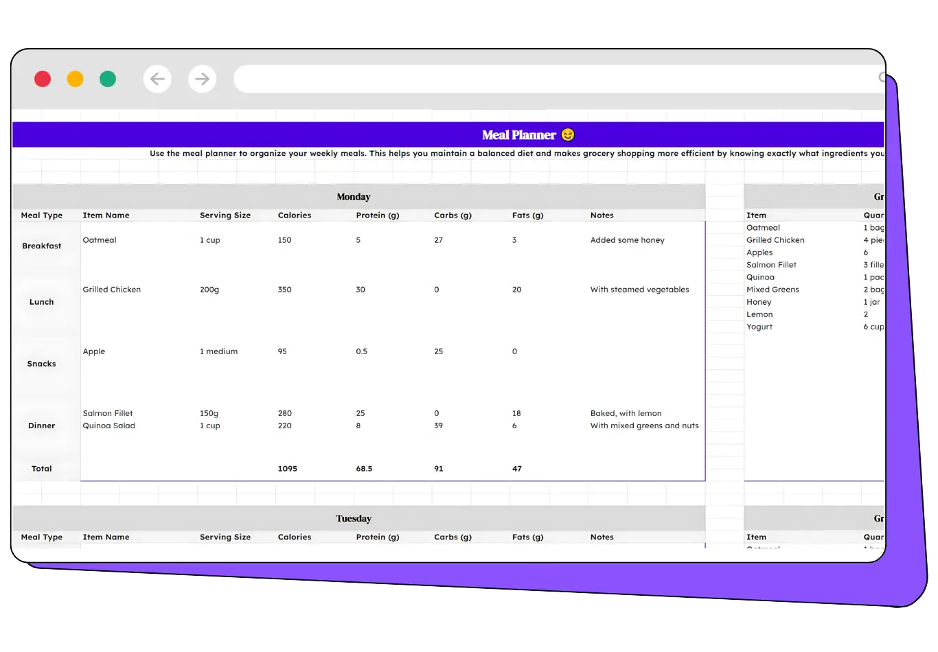 Attached to every day is a grocery list, making your shopping trips efficient and ensuring you have everything you need for your planned meals.